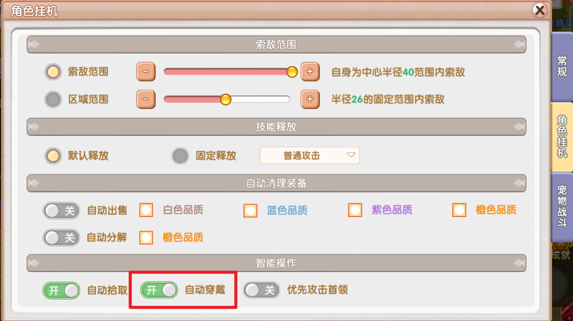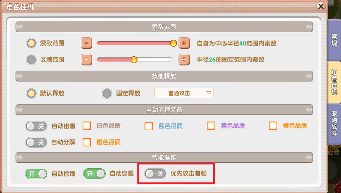 3. 新增设置功能-角色挂机-优先首领功能,玩家可以在自动战斗时优先攻击新刷出来的首领;