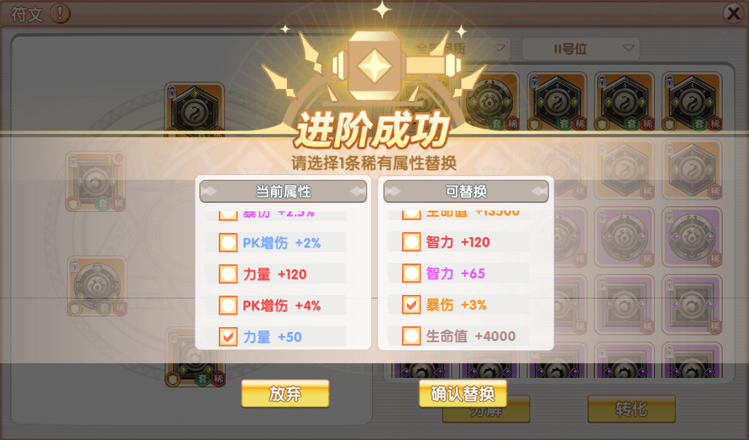 使用升阶功能,可将拥有优秀副属性的符文替换掉原有符文的其中一条副属性。