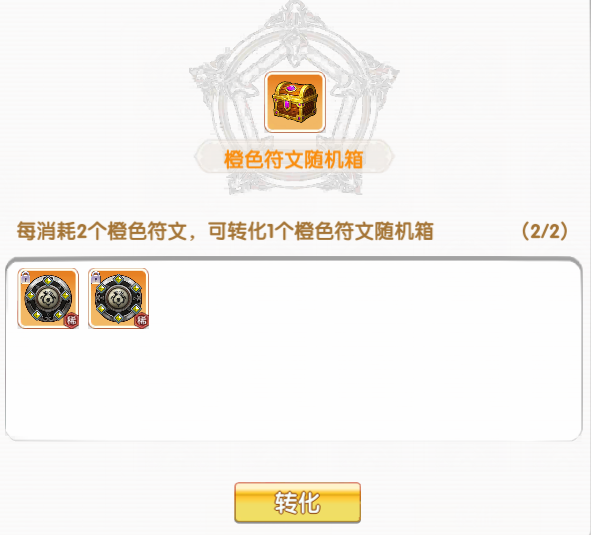 升阶需要消耗一个16级的橙色符文作为“材料”,对身上同位置的16级橙色符文进行升阶。 注意:确保消耗掉的16级橙色“材料”符文拥有你想要的副属性词条 转化可以将任意2个橙色符文转化为1个【橙色符文随机箱】(随机开出一个橙色符文)。 谨慎尝试!操作风险较高。橙色符文是珍贵的资源,无论是作为主力/过渡穿戴、吞噬经验材料、进阶材料都是必不可少的存在。