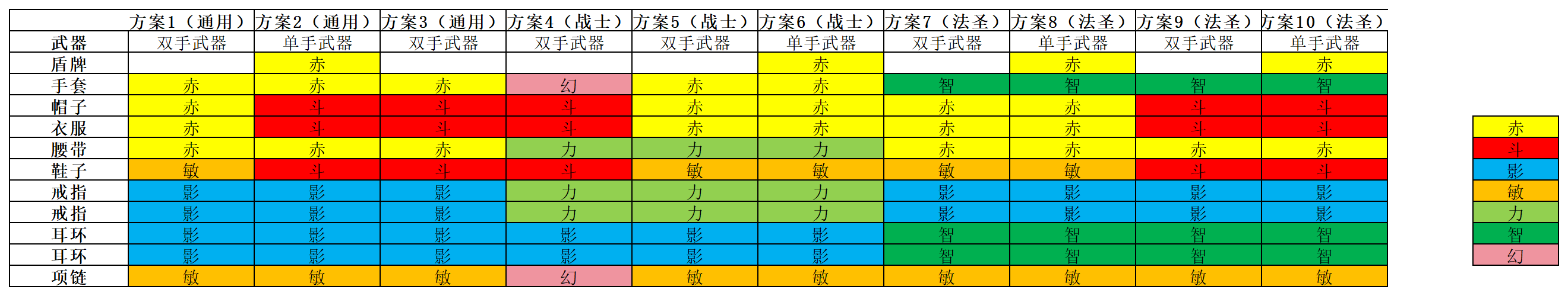 适用魔导士/圣职者。对比上述方案,把双手武器换成了单手武器+赤盾,激活赤套的第四条属性,坦度大大提升,带来更多的生存空间,适用各种需要持久战的场景,例如地图领主、世界BOSS等。 方案三