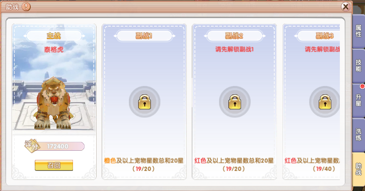 宠物助战携全新挑战降临 冒险之旅再添华章 新增内容1. 新增“宠物助战”功能,玩家可以上阵多个宠物并且享受它们的技能加成,将在开服60日后开启第一个助战位解锁,解锁需要满足前置条件;